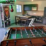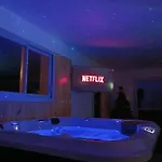 Logement Insolite Avec Jeux Et Jacuzzi villa comes with a bathroom with a hot tub. A hair dryer and dressing gowns are also featured for your comfort.